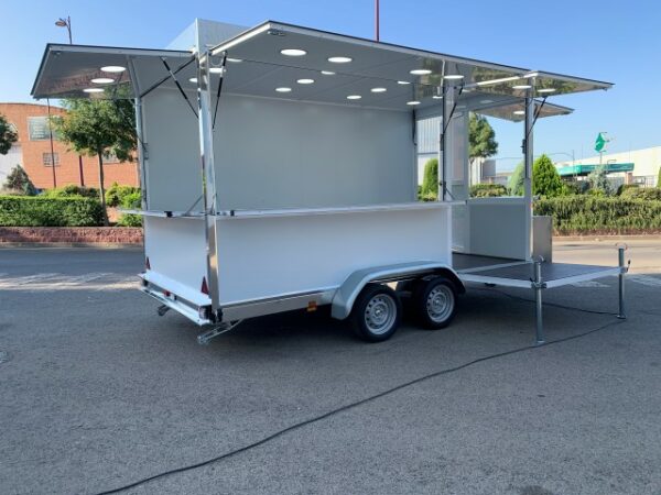 Remolque food truck con puerta lateral para poder sacar el horno cómodamente, ideal para pizzerías, papas asadas… etc.